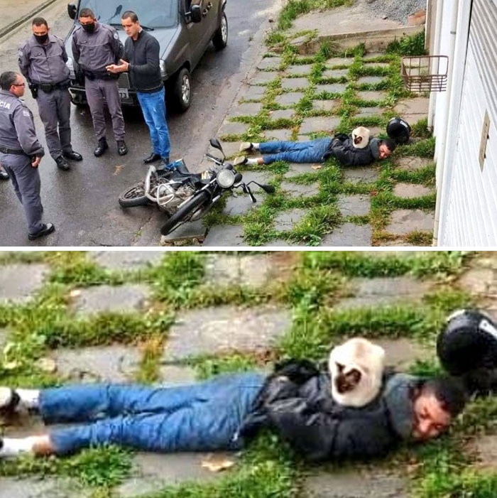 HAHA! “Cat detains motorcycle bandit as police conduct investigation into his whereabouts.”