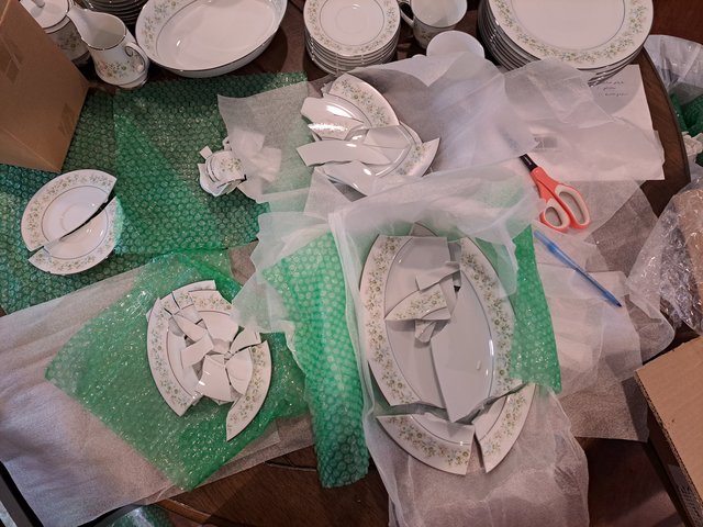 Received the first set today – 5 PIECES were broken – it’s over $200 to replace them individually – so sure hoping the shipper sent them via USPS insured. The seller packed them beautifully and even had a very carefully marked box – THIS END UP – FRAGILE – FRAGILE – the carrier turned it sideways – apparently they don’t read anymore. Alas, our postal carrier is also one who cuts cards open and steals the contents at Christmas time. Never a word back from the complaints department at the IG’s office for the Post Office. I know it’s not managed supposedly federally anymore – but it seems to be just another NGO hell bent on making our lives frustrated.