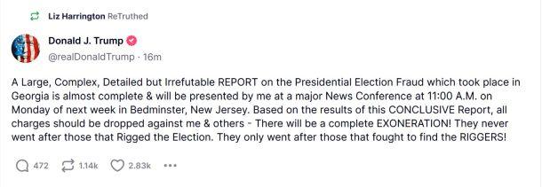 A Large, Complex, Detailed but Irrefutable REPORT on the Presidential Election Fraud which took place in Georgia is almost complete & will be presented by me at a major News Conference at 11:00 A.M. on Monday of next week in Bedminster, New Jersey. Based on the results of this CONCLUSIVE Report, all charges should be dropped against me & others – There will be a complete EXONERATION! They never went after those that Rigged the Election. They only went after those that fought to find the RIGGERS!