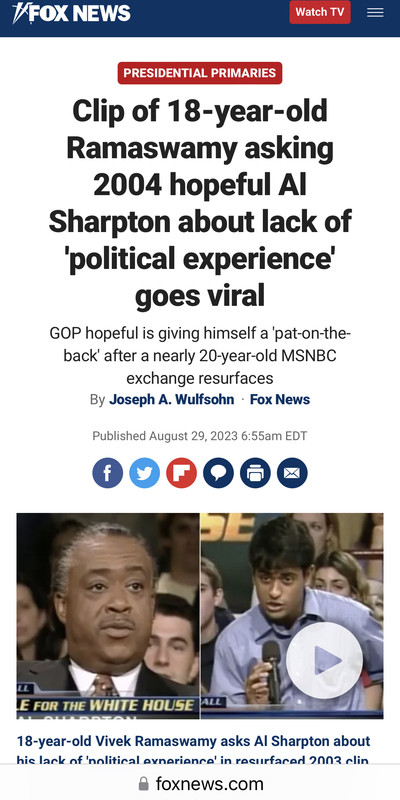 FYI, yesterday President Trump answsered a question by not denigrating Vivek. I read the headline but didn’t hear the quote or what the journalist ( so called) asked President Trump. I think President Trump said what he said beacuse he knows he doesn’t have to fight Vivek for the nomination and it is true Vivek has ideas.