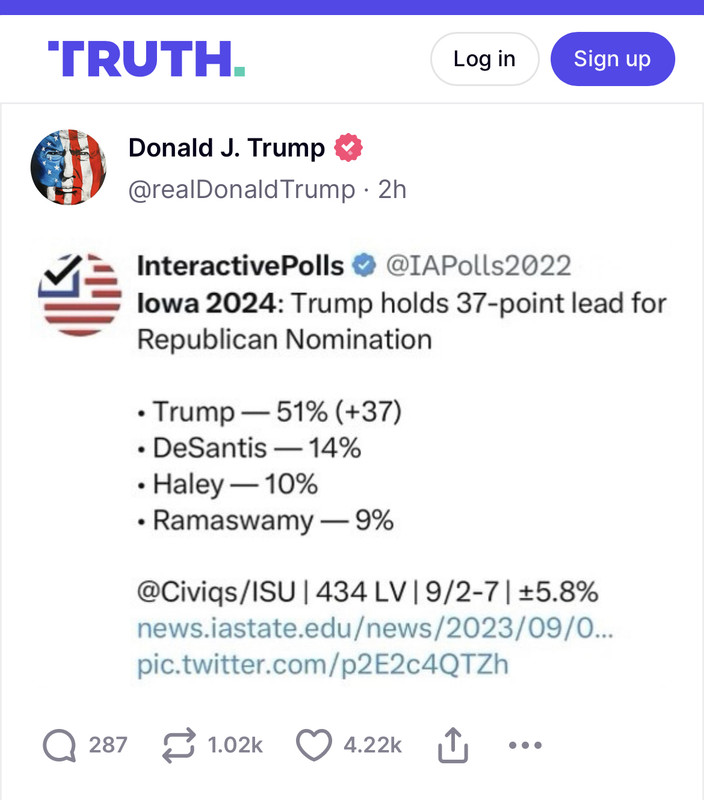 The latest polling from Iowa State University shows this problem in real time. [LINK] AMES, IA — Donald Trump far outpaces other Republican presidential nominees in an Iowa State University/Civiqs poll, which surveyed 1,128 registered voters from Sept. 2-7. The results are the first in a five-part, monthly poll intended to track shifting voter perspectives before the Iowa caucuses on Jan. 15, 2024.