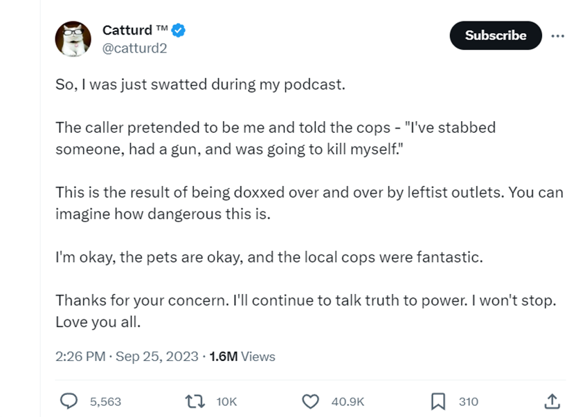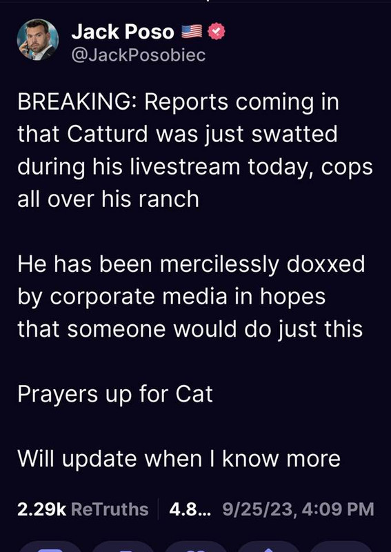 Catturd isn’t at home when he does his Podcast. A neighbor had to call him to tell him what is going on. even then it was hard to get him to call back because he was on air with Jewels at the time. It would have been hard for the Police to call Cat.
