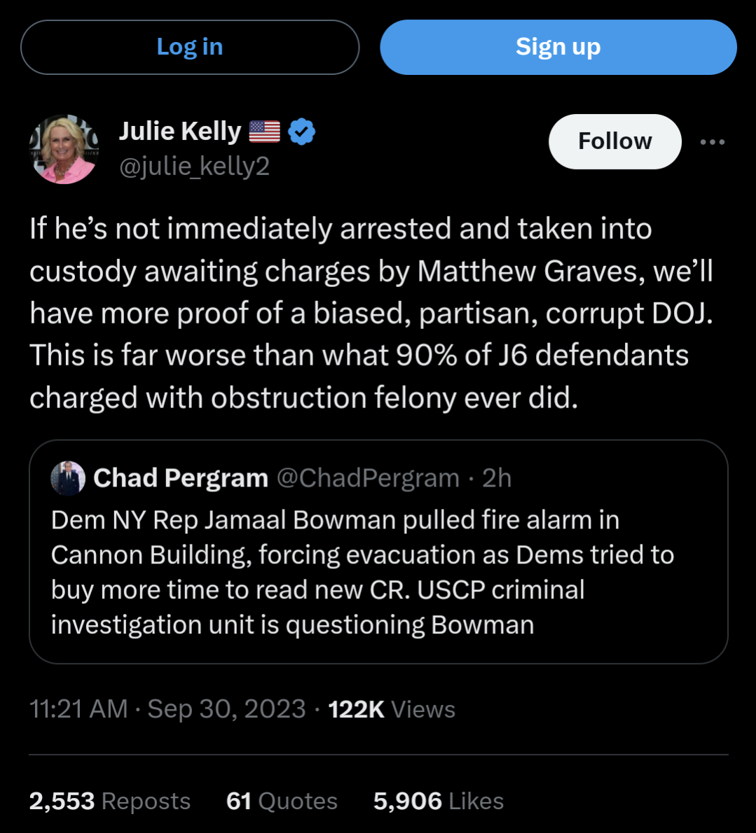 (Via Politico) – Rep. Jamaal Bowman (D-NY) pulled the fire alarm in a House office building as his party tried to delay a vote on a hurried House GOP stopgap spending bill, according to the Republican-controlled Administration Committee.
