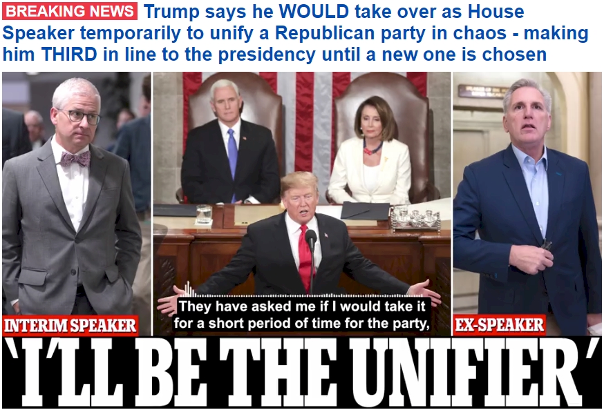 Donald J Trump – “I am running for President, have a 62 Point lead over Republicans, and am up on Crooked Joe Biden, despite the Democrat Party’s massive Law-fare, Weaponization, and Election Interference efforts, by 4 to 11 Points, but will do whatever is necessary to help with the Speaker of the House selection process, short term, until the final selection of a GREAT REPUBLICAN SPEAKER is made – A Speaker who will help a new, but highly experienced President, ME, MAKE AMERICA GREAT AGAIN!” [SOURCE]