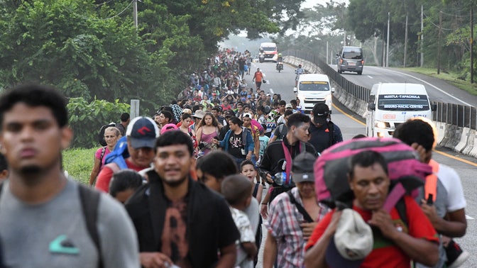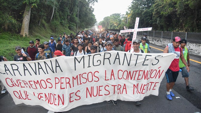 Migrants hold a banner that says, “Migrants caravan. We want permits. The containment you sell is our death,” as they take part in a caravan toward the border with the U.S. in Tapachula, Chiapas State, Mexico, on Tuesday. (Isaac Guzman/AFP via Getty Images / Getty Images)