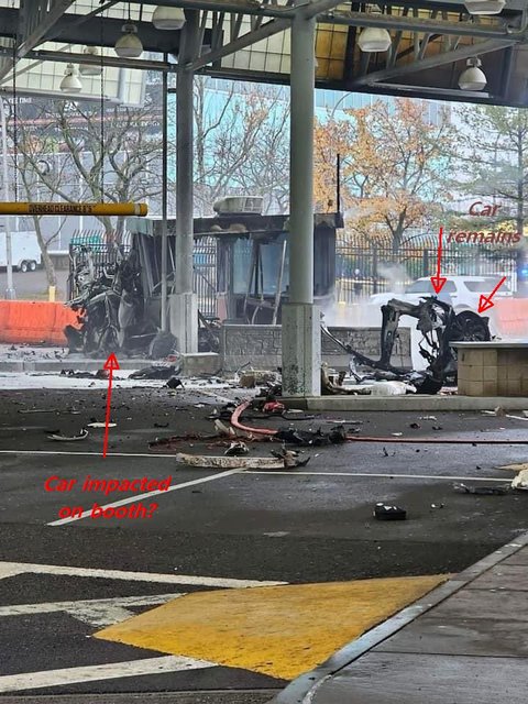 If that’s the car impacted on the booth, no explosion, just a gas fire and debris. Also note the hanging lights above the area aren’t shattered, as isn’t the glass in the adjacent booth.
