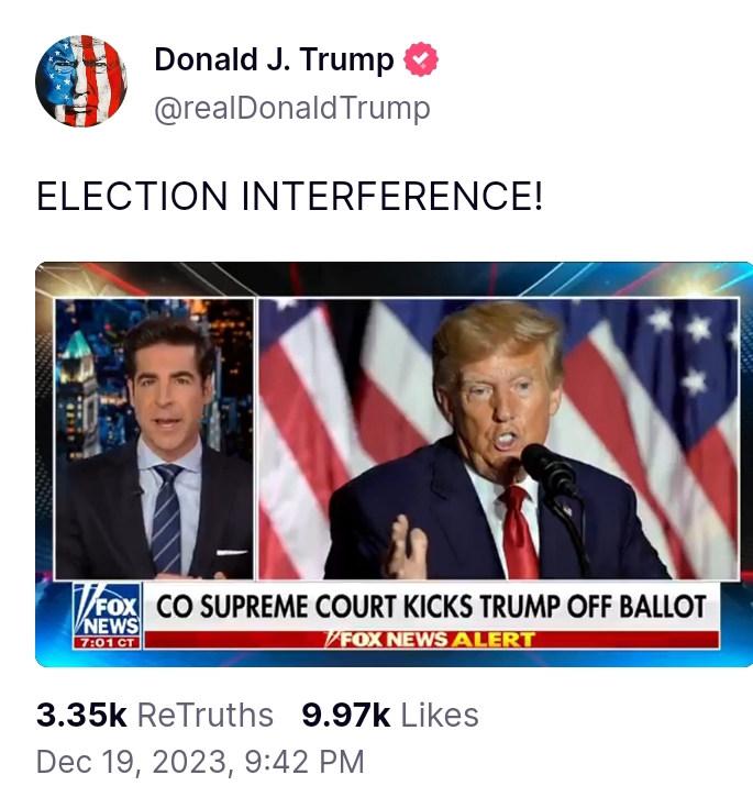Ok. So hopefully, SCOTUS will let Trump run for President … – but what does this say about the judicial system !!! Most decisions below SCOTUS are not taken by SCOTUS. So numerous people are screwed by a perversion of a justice system. What about justice for the J6ers, Giuliani, … WHY SHOULD WE HAVE ANY RESPECT FOR ANY DECISION FROM THE “JUSTICE SYSTEM”??? Where are the fake fraud phony GOP House – who kicked out Santos even though Santos was not even kangaroo convicted yet – STOP FUNDING THIS – ALL OF THIS – No money from the House of Representatives for DOJ, FBI, IRS etc. No money from the House of Representatives for mutilation atrocities against the children, No more money from the House of Representatives for Ukraine and Iran, No more money from the House of Representatives for DHS if all they do is serve as at taxi service for illegals. No more money from the House of Representatives to violate us with ‘gene therapy’ mandates … – and when a budget is reached the federal bureaucracy will get paid retroactively – IT’S HORRIFIC