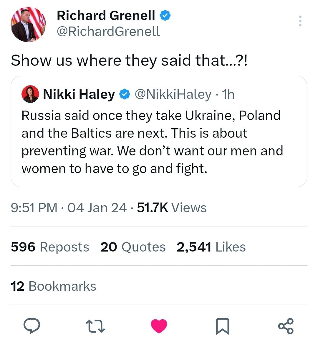 So Nikki Haley’s “Russia said” is false it was proposed by others with no real inside information. This is a just speculation by Ukraine sycophants who are opposed to Russia! The Baltic countries have a lot of ethnic Russians living there but as far as I know don’t have Nazis killing them like the Ukraine was doing!!! If they were doing that then I would be concerned about Russia stopping that killing!!! With that misleading tweet above Nikka solidified her neocon bon fides!!!