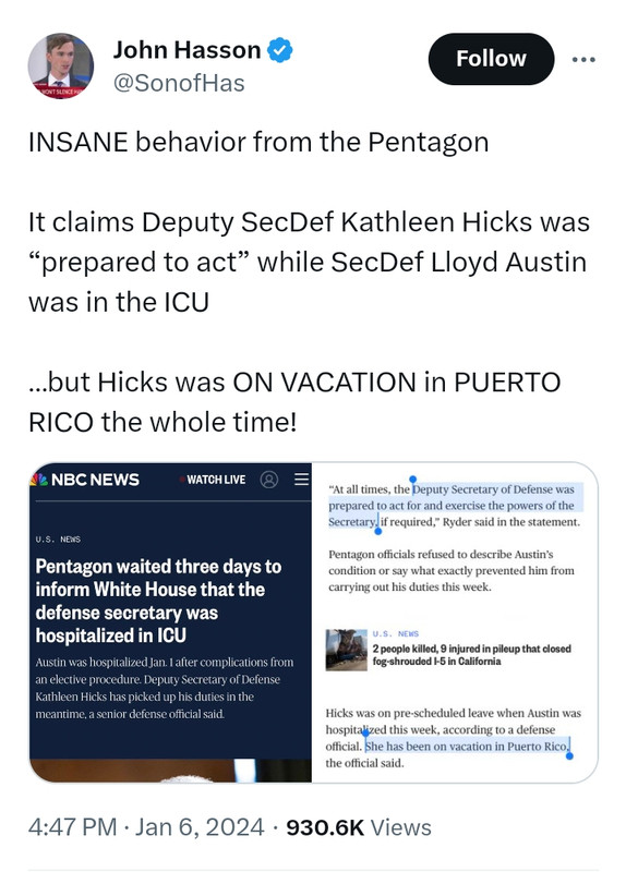 This update follows the admission that Defense Secretary Austin was hospitalized in intensive care for four days beginning January 1st, and no one in the White House, National Security Council or State Department was aware. Secretary of State Anthony Blinken confirmed his lack of knowledge earlier today.