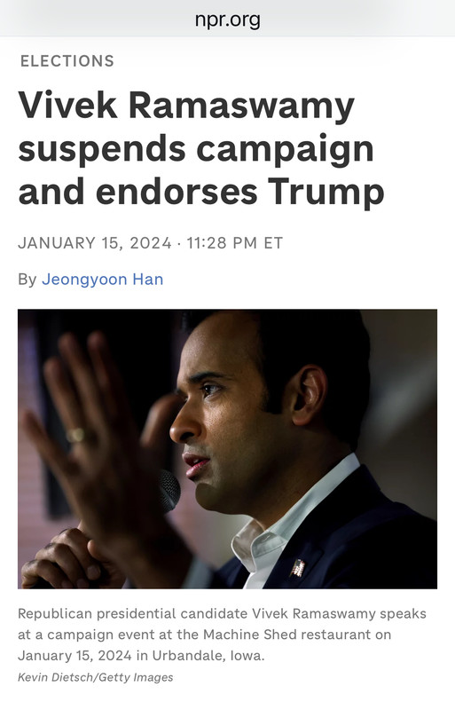 Neither CNN, MSNBC, nor Fox aired the concession speech by @VivekGRamaswamy despite, or perhaps because, the fact that he endorsed Trump, which is bigger news than anything either DeSantis or Haley said.