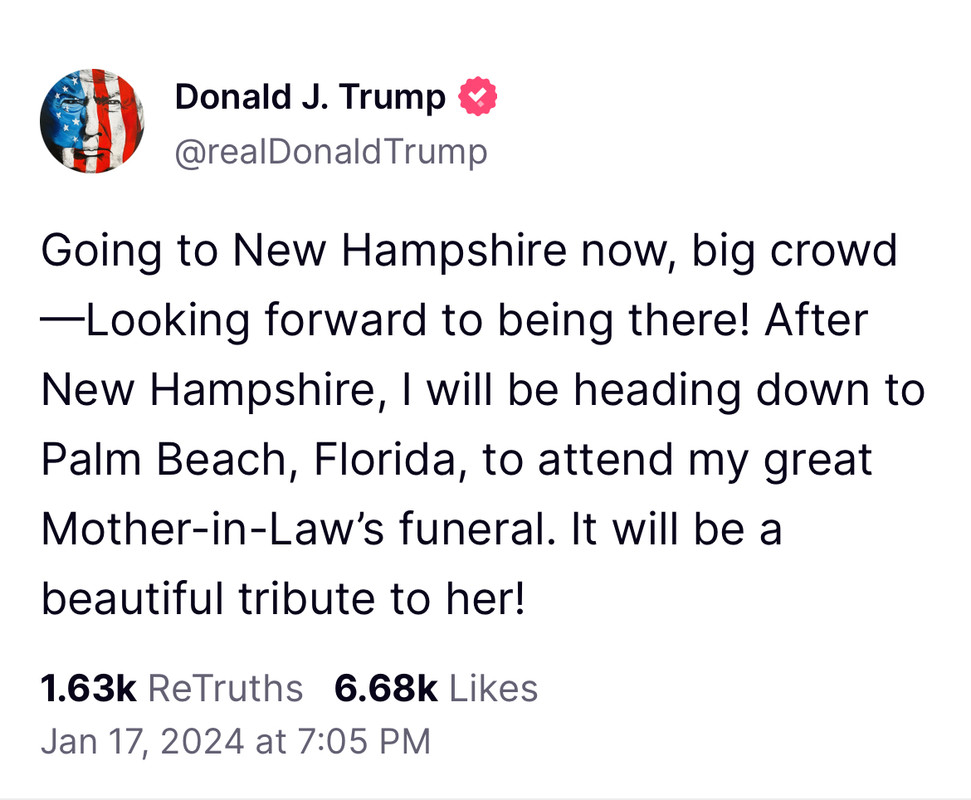 Has President Trump announced whether or not he will be attending the funeral for Melania’s mother tomorrow? I saw that the judge refused to delay his defamation trial for even one day, which, understandably, frustrated and angered him, but he didn’t specifically say where he would be tomorrow. Personally, I think he needs to be with his family, and that will also speak volumes as to the character of the judge!