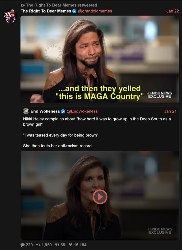 I characterize this as Triki Nikki entering her newly acquired “Kamala modeling” now that she’s taken her inner Hillary about as far as you can go. Now it’s to pick up people of color no longer wedded to the plantation & sympathy vote from white liberals.
