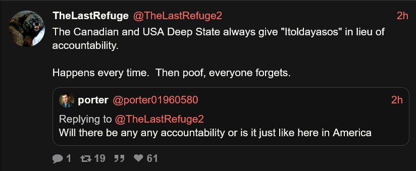 I gotta find video. Pretty sure i posted or saw on a CTH thread. Still looking. My mood has brightened considerably thinking about it and how it relates to the temporary win today for our Canadian friends like dekester and all.