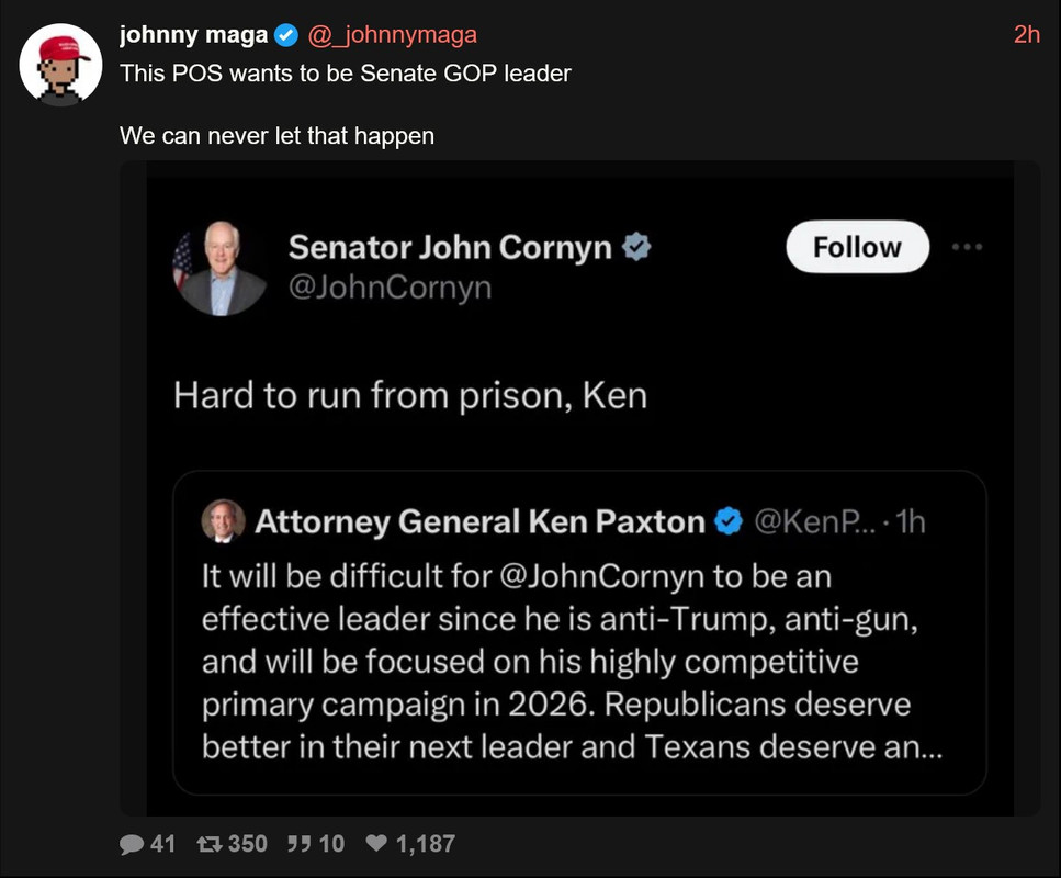 Good luck to y’all in Texas!! The RINOs and the Lefties are trying really hard to take your state from Red to Blue. Praying for true Texas to rise up and take it back!