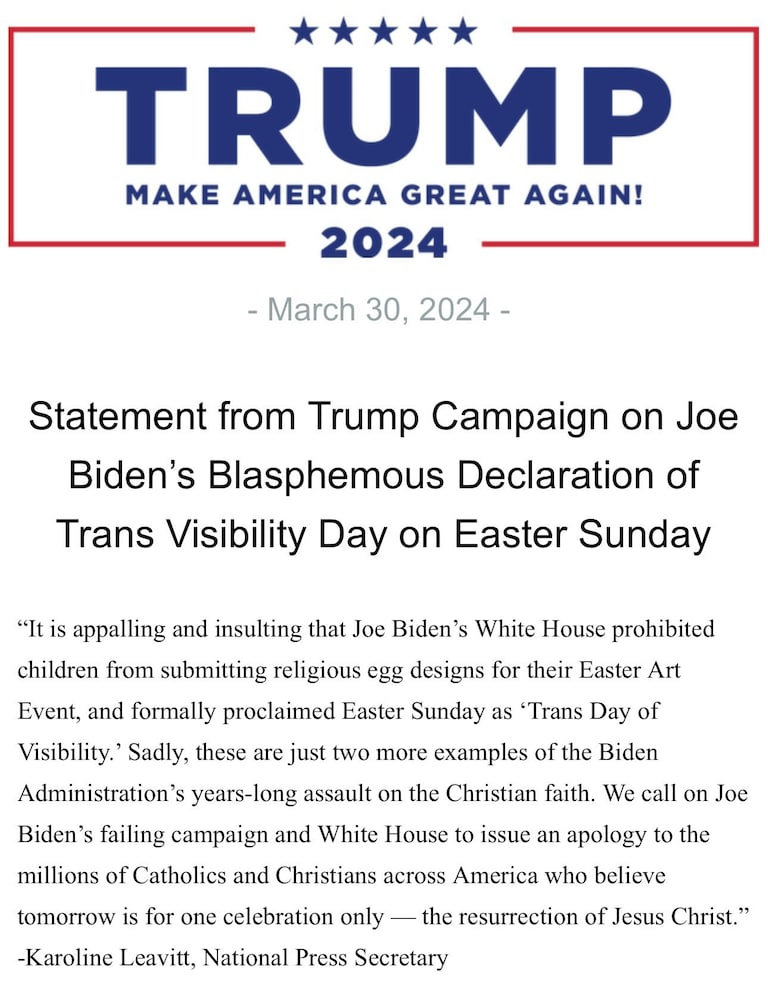 Statement from Trump Campaign on Joe Biden’s Blasphemous Declaration of Trans Visibility Day on Easter Sunday