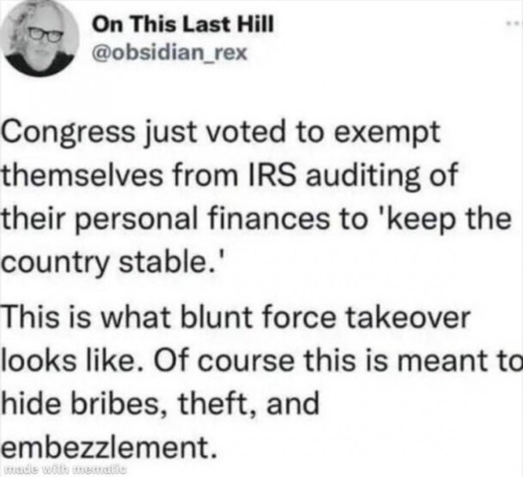 If you are in the House or Senate in DC, you are either already compromised, or at the very least deemed corruptible by the IC. If not “captured” by the end of your first term, you will be primaried or “encourage” to resign.