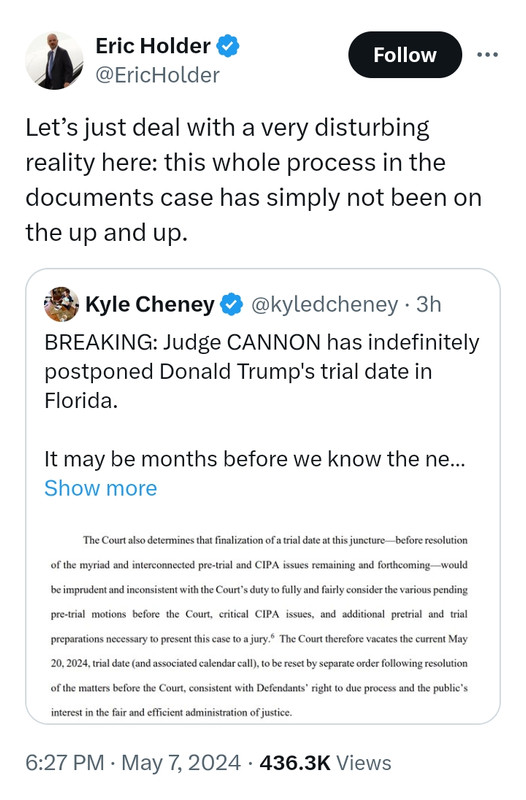 Judge Aileen Cannon has issued an order [SEE HERE] canceling the original trial date and suspending the trial proceedings pending resolution of multiple pre-trial issues. Lawfare is big mad.