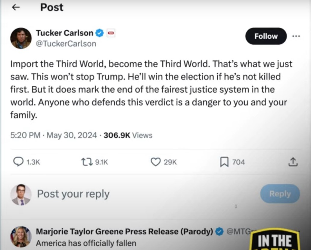 Import the Third World, become the Third World. That’s what we just saw. This won’t stop Trump. He’ll win the election if he’s not killed first. But it does mark the end of the fairest justice system in the world. Anyone who defends this verdict is a danger to you and your family.