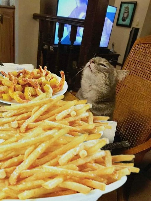 The look on that kitty’s face says it all. Bet he gets some! (With lots of tarter sauce, yum)