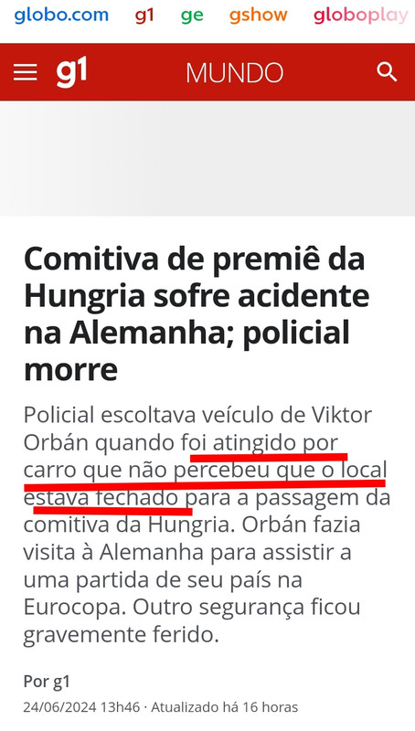 A police officer was escorting Viktor Orbán’s vehicle when he was hit by a car that did not realize that the place was closed for the Hungarian delegation to pass through. Orbán was visiting Germany to watch his country play in the European Championship. Another security guard was seriously injured.”