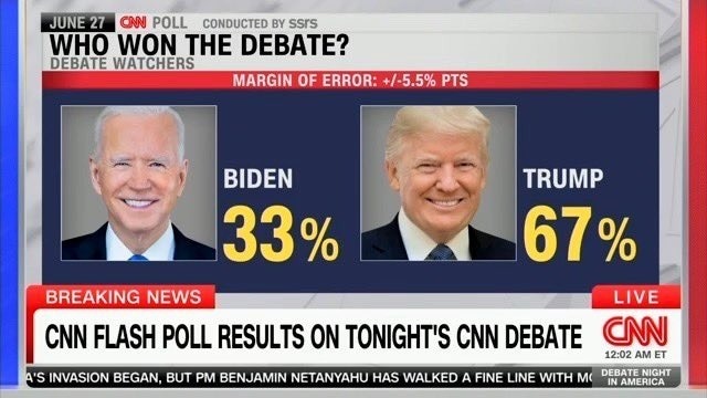 It is scary that 1/3 of the viewers thought Biden won the debate. They should have had a third category. Tied. That would have given the viewers that could not vote against Biden, to have an “out”. My guess is Trump and Tied would have garnered 90%. That would have left the absolute hardliners for Biden.