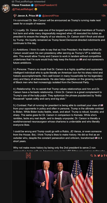 Like I said in the Open Thread earlier: Do these hints in the fundraising emails mean anything? Might Trump REALLY announce VP at the rally? And if so, if there’s a reason it’s Florida, there are 3 big names it could be. Donalds, Rubio, or Carson. Hopefully it’s Ben… but if not, Donalds seems okay from the little I know. PLEASE not ‘Lil Marco.