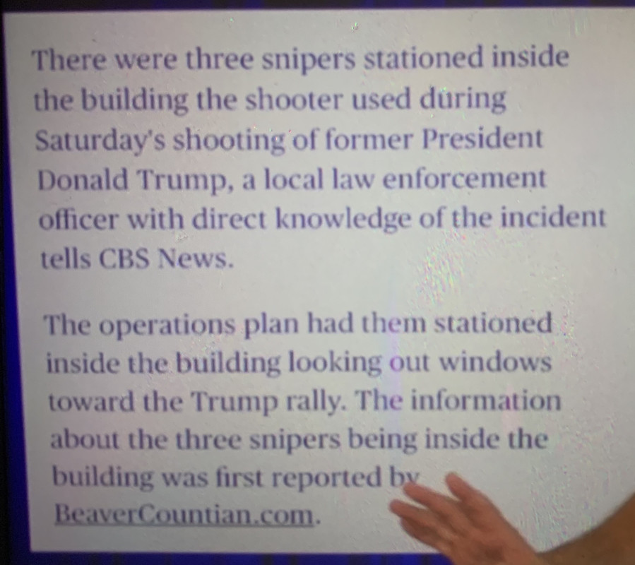 “The 3 different shooters are Crooks and 2 different law enforcement snipers?” I watched a longer version of the analyst guy talking about it. According to him, there were 4 shooters.