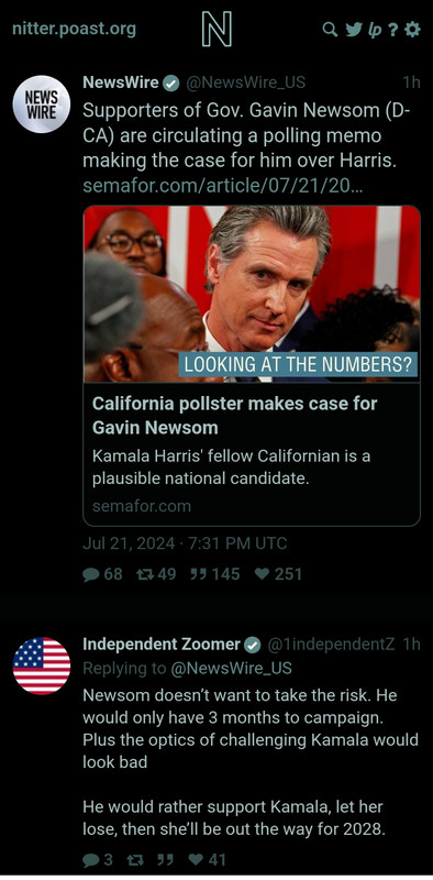 I am concerned a little. Another candidate, other than Harris, will not have the obvious baggage that former VP Biden has. Yes, Newsom has run Cali into the ground, but to the casual voters, this not well known. Trump can and will pound on Newsom’s record. But to the casual voter in Wisconsin or Pennsylvania California is a distant place, still the land of milk and honey in the eyes of many.