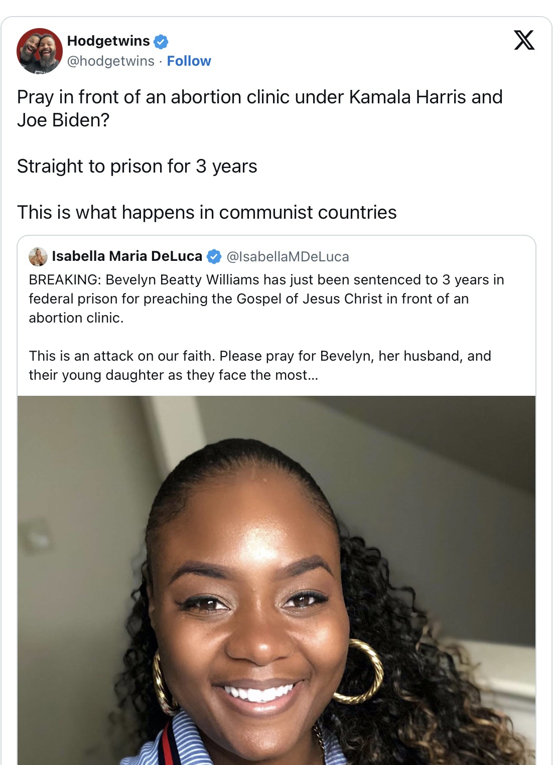 I pray that President Trump on his first day in office pardons this Christian and others who prayed in front of infanticide clinics currently in jail and all the J6ers!!! Godspeed Bevelyn Beatty Williams!!!