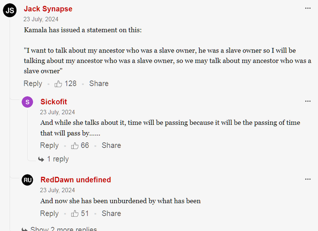 Kamala puts on blackface when it benefits her and the Democratic Party, don’t forget that she put a lot of black men behind bars to build her career, used them like steps!