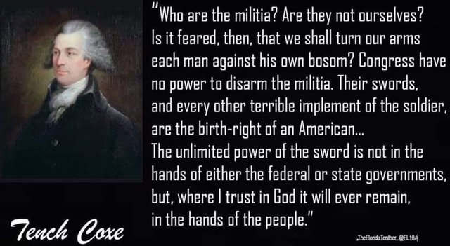Reality is that when the debate was occurring among our nation’s founders, one of its proponents Tench Coxe, specifically stated that ALL weapons of war should be in the hands of the citizens of the nation.