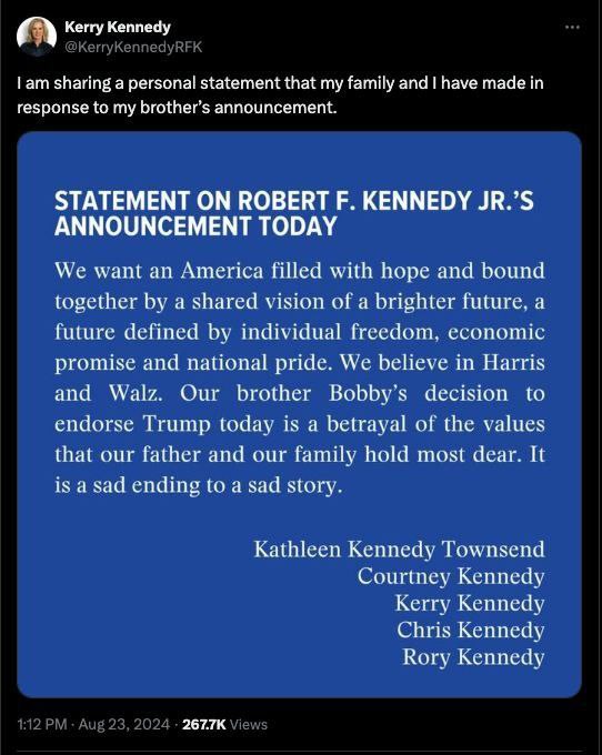If they think somehow that RFK is going to control Trump and that this is now about placing people around Trump to handle him if he wins like last time is a major major gamble and assumption on their part. It makes a lot more sense for them to have left RFK where he was, play his part, and pull whatever he could from Trump at election time.