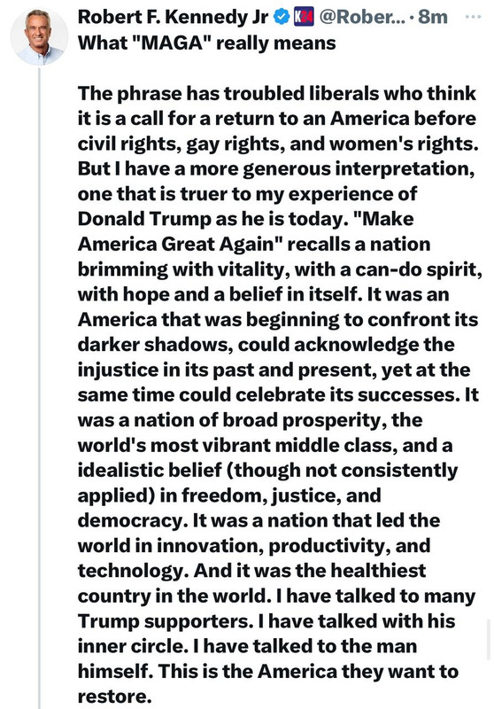 Your words are true and accurate. RFK will have to prove his goals are going to be meshed into MAGA goals and he needs to follow through on them as you said SD. Onward we go and hopefully God just gave us a big boost in the right direction. We shall see how Bobby follows God’s message and the opportunity to make a genuinely moral difference that He gave to him. Tempered hope and prayer here that this goes well. The enemy will be looking to stop this in a major way so be vigilant and shine the light where it needs to go.