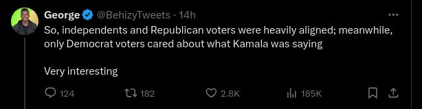 The cocktail party Left was still fawning over Kamala’s debate performance when Reuters, (no fan of Trump), dried up all that saliva by reporting that undecided-before-debate in their focus group were breaking for Trump after the debate.