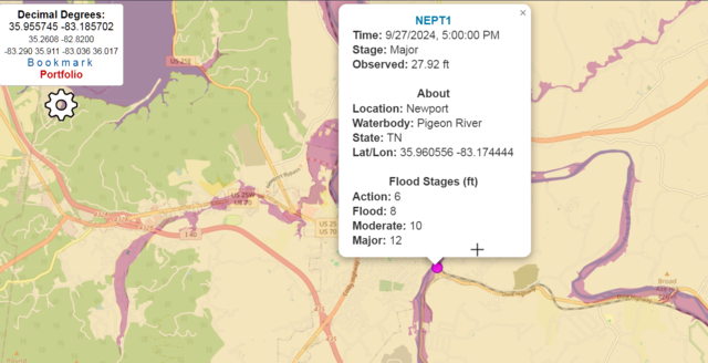 The Pigeon River is at 28 feet on the southeast side of Newport – major flood stage is 12 feet.