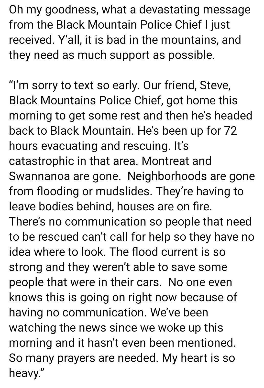 A friend contacted me today trying to get some help to his family in Spruce Pine. He finally heard from his niece today and they can not get out. Have been through all of my contacts and they ate either on their way or already in other areas