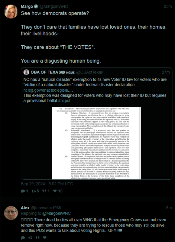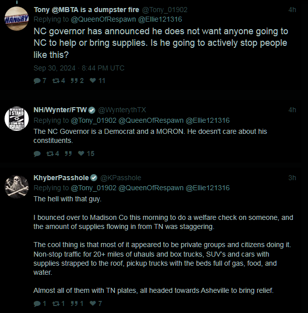 I applaud the TENN and FLA Gov’s for their efforts …. and what ever NC assets that have acted … but … the NC State and Federal Governments have purposely failed to create a disaster to be “heroically” solved.