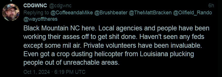 The only accurate information we’re getting out of Western North Carolina is from the local talk radio. 98.9 and random posts on FB from those on the ground. Every single county in Western North Carolina has been affected if not devastated. What we hear from the alphabet media seems to center on Asheville. While that’s terrible and my heart goes out to them, there are large numbers of small mountain towns that are no more with a trapped population, no way in or out. People from the surrounding area with big equipment and helicopter resources, organizations like Samaritan’s Purse, and emergency personnel and linemen are working around the clock with no federal help. The Cajun Navy even came yesterday to assist.