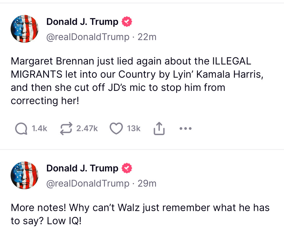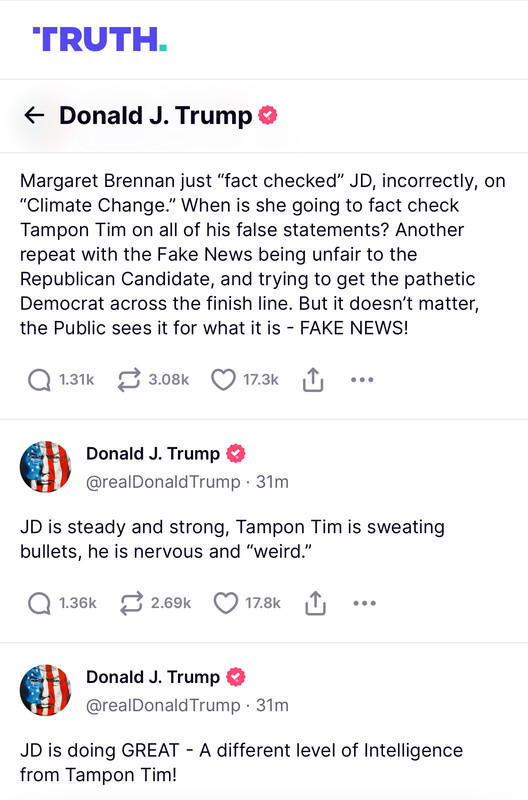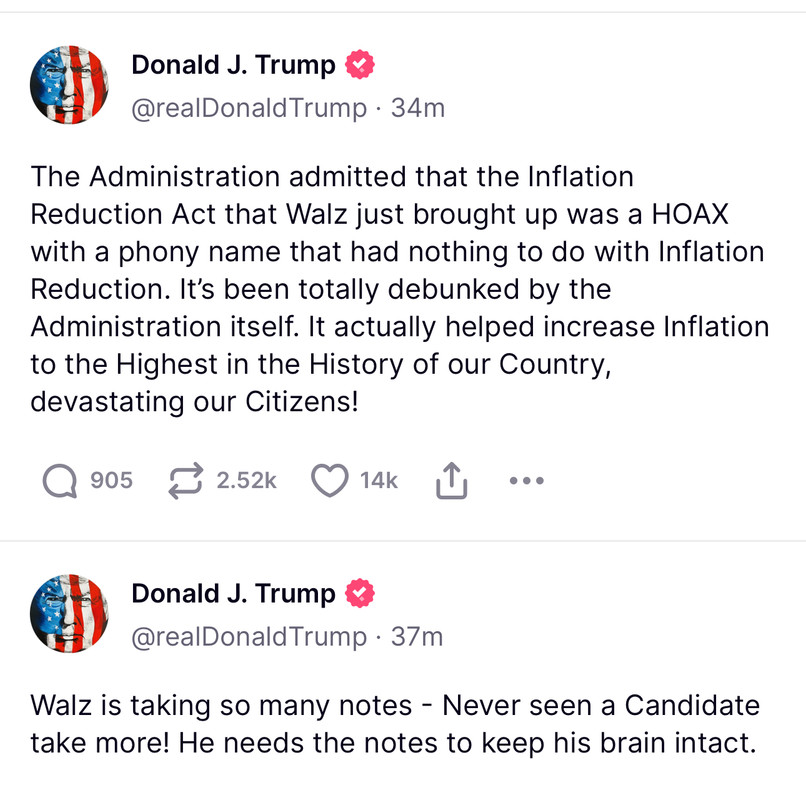 Must say… both have done a good job thus far, are performing well, and Walz even comes off as sincere and knowledgeable. The issue is America will see thru the moderators agenda, citing job losses/bad economy under Trump, and the lies Walz litters throughout his comments. It is comical Walz seems to have forgotten we have the internet and other news platforms vs MSM… his “tell” (think poker) when the pace of his speech goes into overdrive.