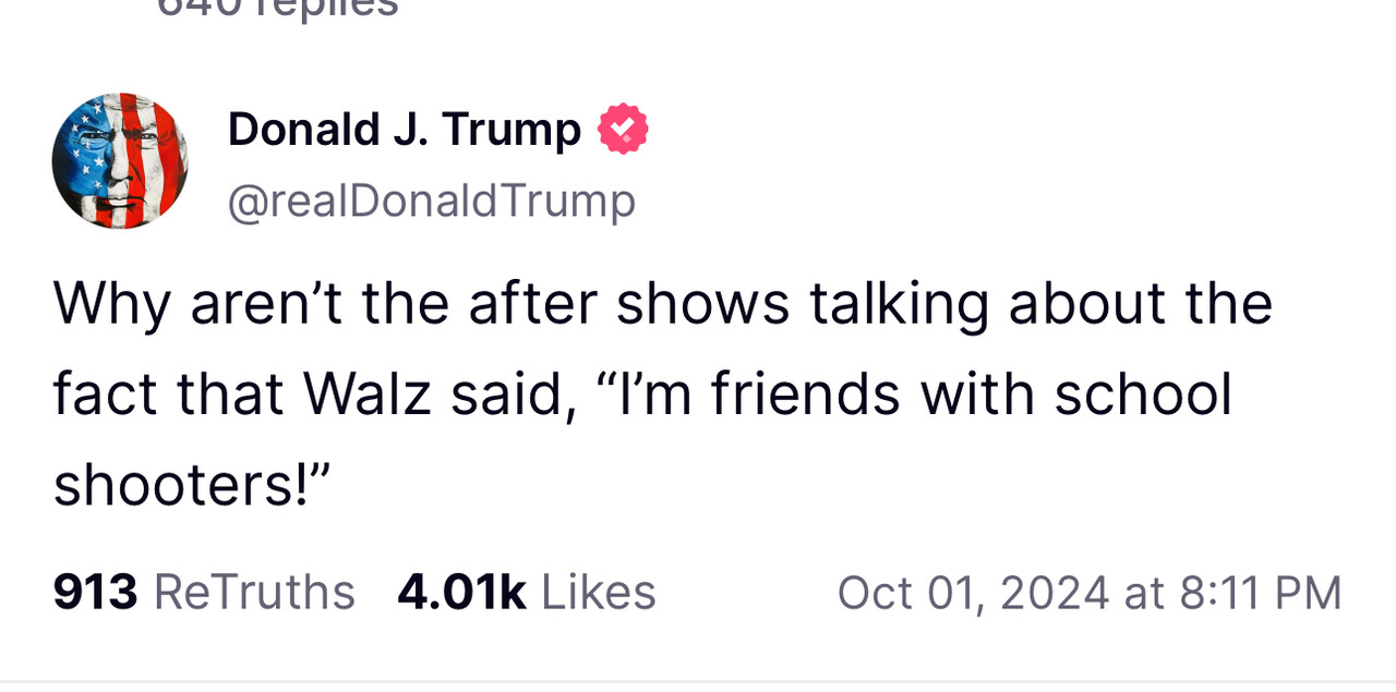 Walz did better than I expected. I hated how he brought up some things that were clearly wrong, but there wasn’t time for JD to respond. That made it look like Walz’ lies were true. I worry the masses who don’t follow this stuff like we do will be fooled that Walz is really that ‘nice guy’ he has been pretending to be (when he is really a communist).