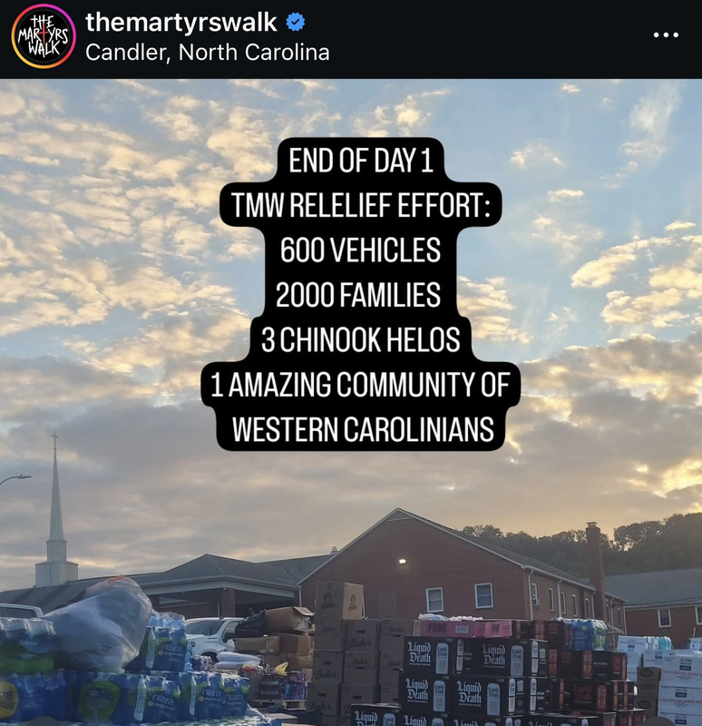 Together, we have raised a total of $528,439 (with people continuing to DM me w/ donation receipts) going towards 7 different charities directly helping the Americans dealing with the devastating aftermath of the deadly Hurricane Helene.