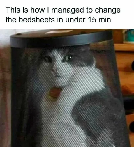 I don’t know whether to laugh or cry when changing sheets. There are cats under the fitted sheet, grabbing at the flat sheet as you attempt to spread it out, and in the laundry basket. It’s catastrophic!