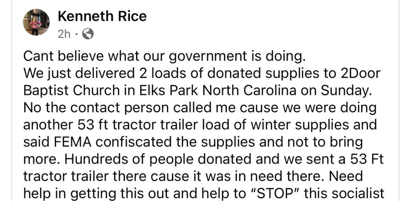 Yet another example of FEMA seizing donated supplies from Church orgs in North Carolina