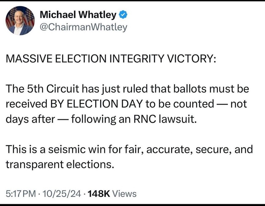5th US Circuit Court of Appeals has just ruled that mail-in ballots must be received by election day to be counted. It is for a case in Mississippi.