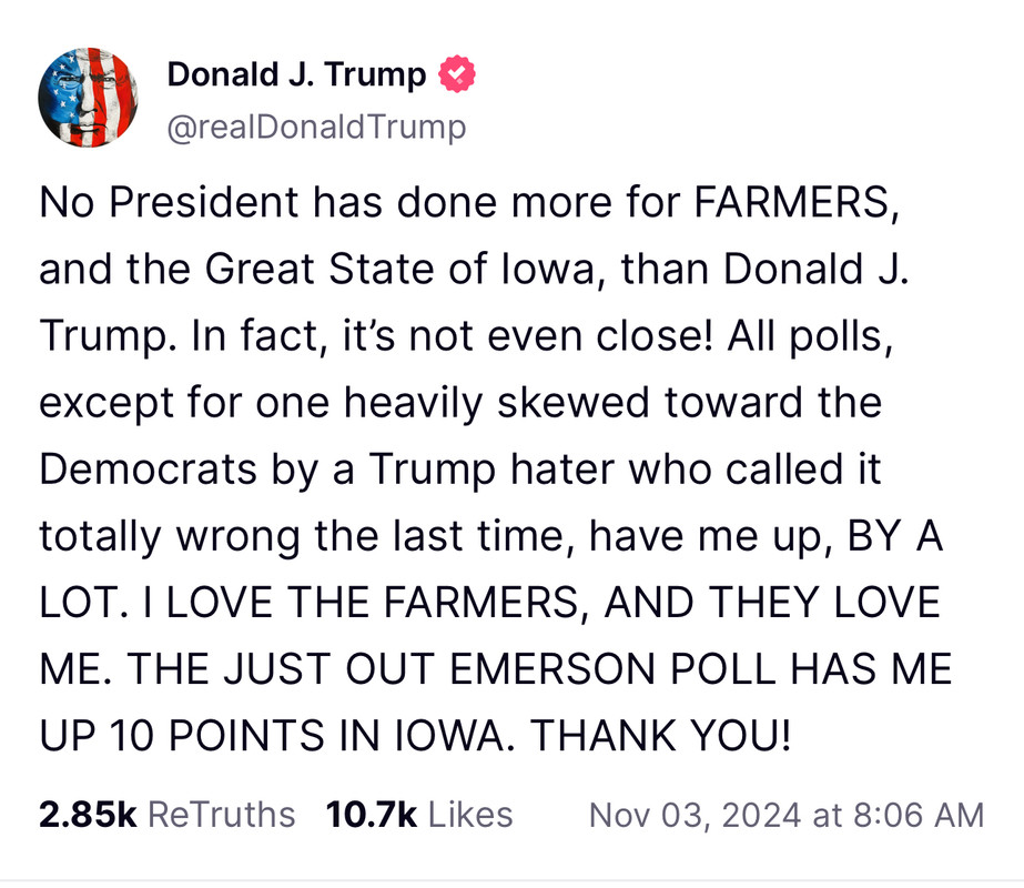 Iowa will go to Trump by 12. This poll was dumped to mislead about the rest of the Midwest and was leaked to key Dems before it was published. It should be investigated as an anti-corruption measure and we should know what Selzer was paid or threatened with.