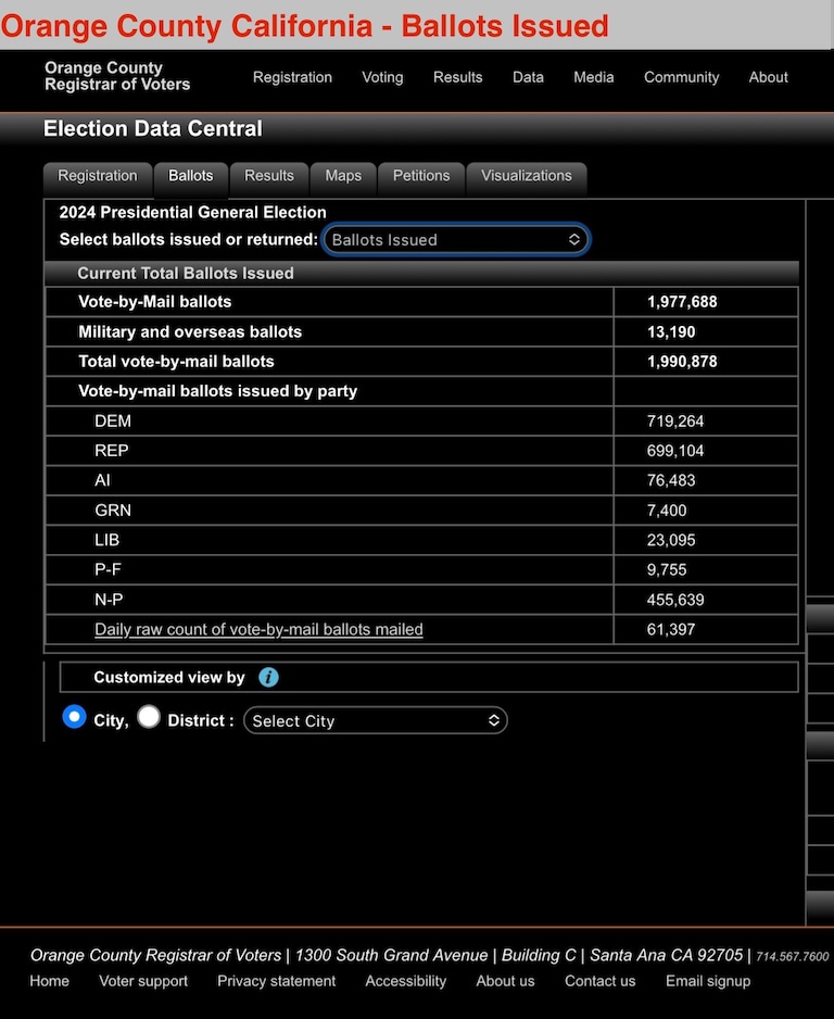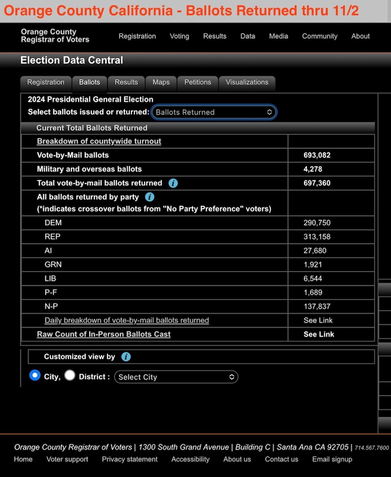 Orange County California Ballot Stats as of 11/2 (100% mail-ballot, Early In-person voting opened 10/26)