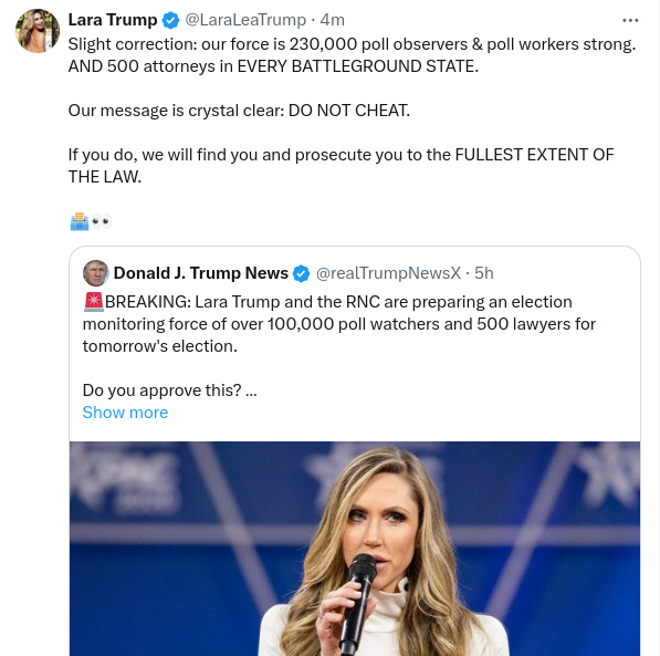 I hope team Trump has a rock solid plan in place in real time to address the situation STAT if the counting is shut down in the wee hours of the night as it was in 2020. I also hope they are focusing on the stuffed fake ballot insertions that will be attempted (perhaps successfully) at the time of tabulation. I am optimistic that more is being done to stop the cheatthis time, however.