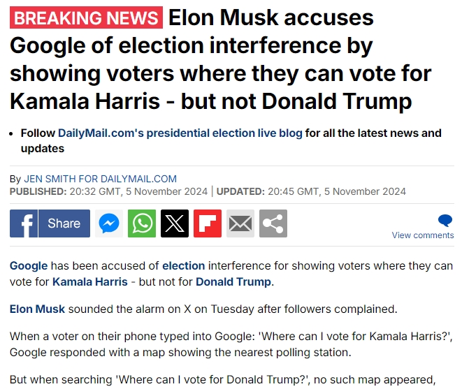When the user uses Google to search for: “where can I vote for Trump” -vs- “where can I vote for Harris” the Google result is entirely different.