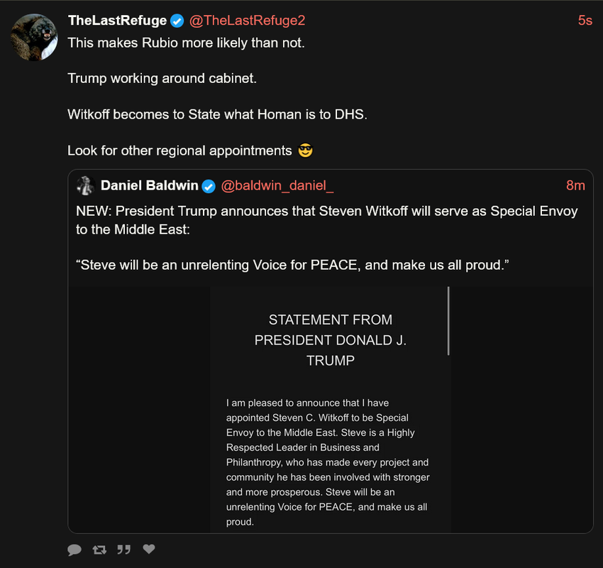 I am pleased to announce that I have appointed Steven C. Witkoff to be Special Envoy to the Middle East. Steve is a Highly Respected Leader in Business and Philanthropy, who has made every project and community he has been involved with stronger and more prosperous. Steve will be an unrelenting Voice for PEACE, and make us all proud…