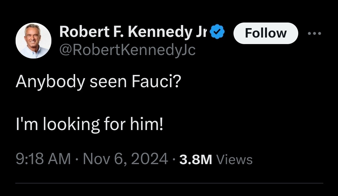 Elon and Vivek: how about removing that $15 million worth of security being paid for Fauci, and transfer the security people to RFK Jr. instead? That would be money well worth spent. “[We] can’t spare this man, he fights!”